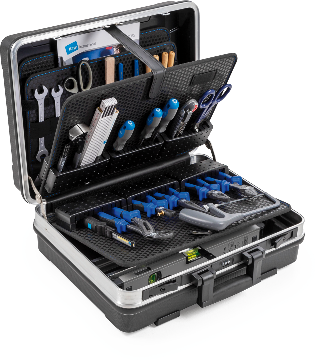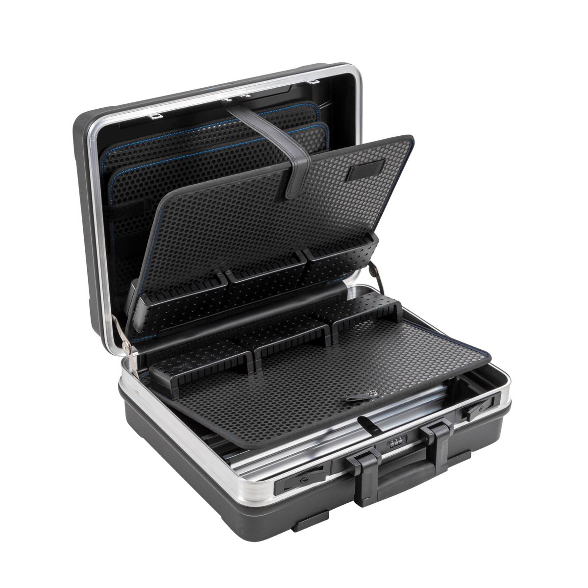The interior of our tool.case base satisfies every desire with its diverse design options. In addition to an A4 document pouch and main compartment subdivided with our patented aluminum divider system—two aluminum dividers, four end caps, two center caps—the following design options are available: