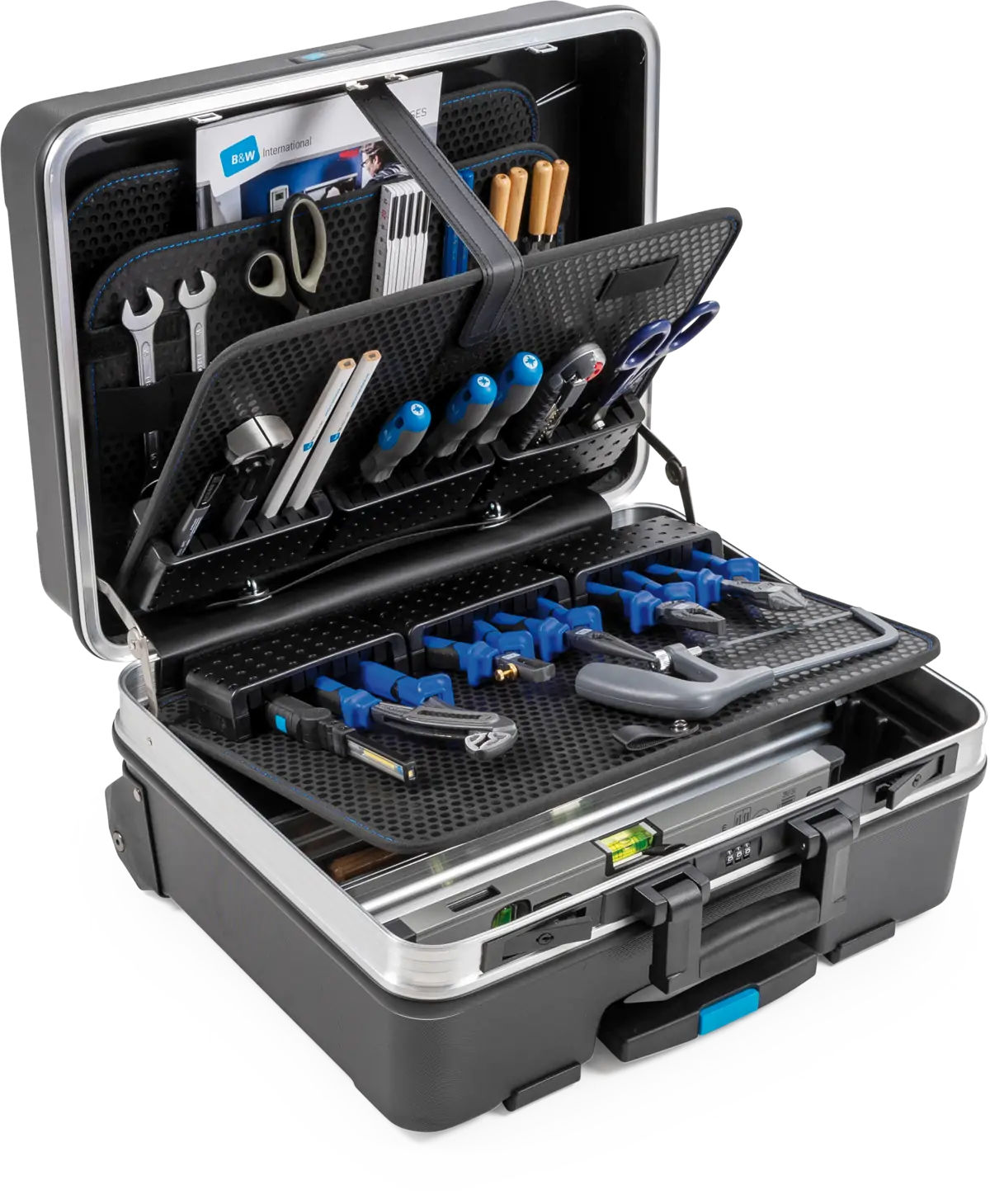 The ultra stable ABS shell reliably protects valuable tools. Four feet protect the bottom of the shell from abrasions from uneven surfaces and preserve the case's modern design. Two locking latches and B&W's PROcode combination lock provide extra security, allowing the case to be securely locked at all times.