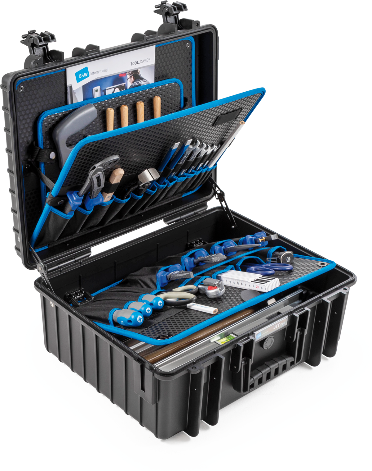 Extremely rugged, impact-resistant, dustproof, and waterproof—these describe the tool.cases in the tough.case series, including the king of the JET series: the JET 6000. The ultra resilient polypropylene shell dependably protects contents, even under the harshest conditions. Whether scorching heat up to 80 °C or bitter cold down to -30 °C, the JET 6000 can take it all. With 109 tool pockets and tool loops total, all of your important tools are at hand for any field work. The generous main compartment provides even more storage room and can be customized with our patented aluminum divider system.