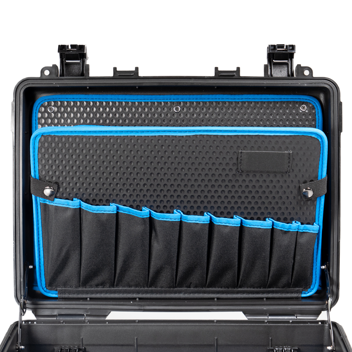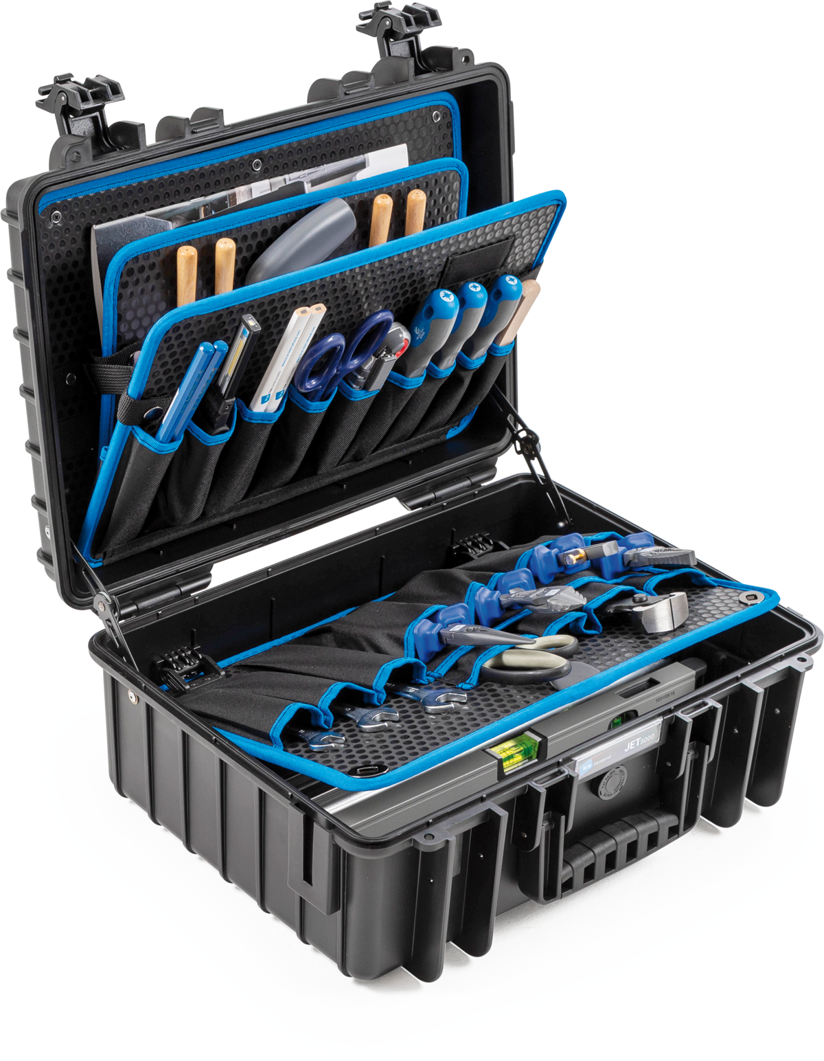 The case that can withstand even extreme stress: The JET 5000 is the happy medium among the tough.cases that was specially designed for extreme uses. The ultra resilient and rugged polypropylene shell withstands impacts and falls with ease and makes the JET 5000 the perfect companion for outdoor use. With 59 tool pockets and tool loops in all, a document pouch in the lid, two removable tool boards, and customizable main compartment, the JET 5000 is a true organization expert, offering plenty of storage space for a wide range of tools.