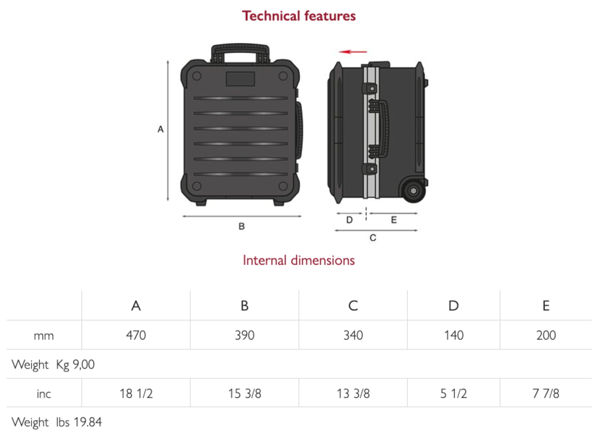 Tool trolley made entirely of HDPE polyethylene, a real shield against accidental shocks. Special extra thick aluminium trim for tight closure. High capacity case ideal for air travelling engineers that carry both tools, spare parts and components.