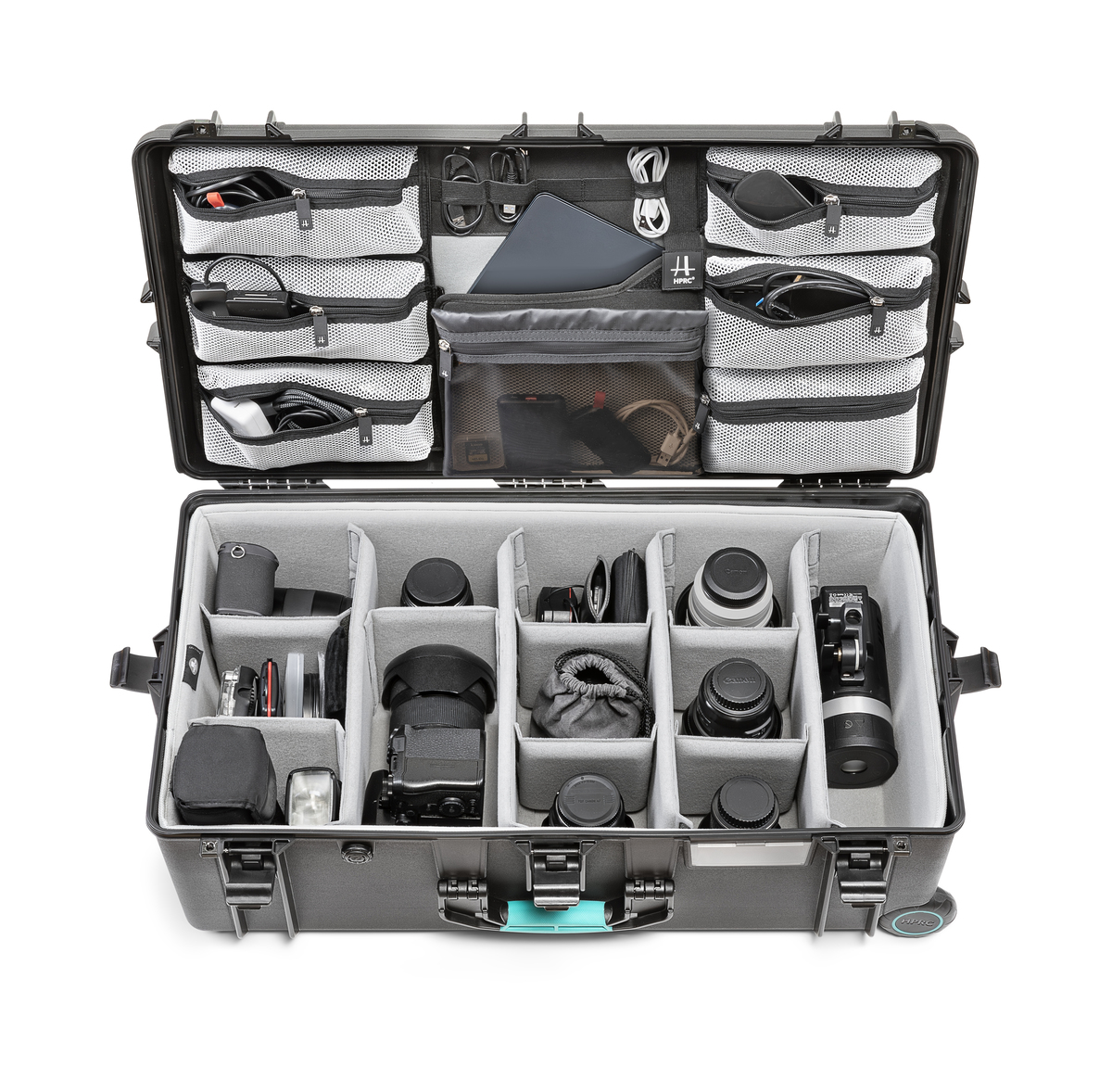 HPRC#2745WPROBLB is a professional wheeled case bundle designed to transport and protect sensitive equipment in demanding environments. This solution integrates HPRC#2745W case in high-performance TTX01® resin, Second Skin™ thermoformed interior and a lid organiser system to deliver maximum protection, organisation, and mobility in one ready-to-use configuration. The structure is engineered as a IP67 watertight and dust-proof professional protective case, guaranteeing reliable sealing even in harsh field conditions as well as perfect resistance to shocks and impacts. Smooth rolling wheels and a retractable telescopic handle allow comfortable transport. Internal organisation is optimised with the Second Skin™ interior, designed to securely hold professional equipment while maximising usable space. The lid organiser with zippered pockets and elastic webbing keeps cables, accessories, batteries and tools neatly arranged and instantly accessible.