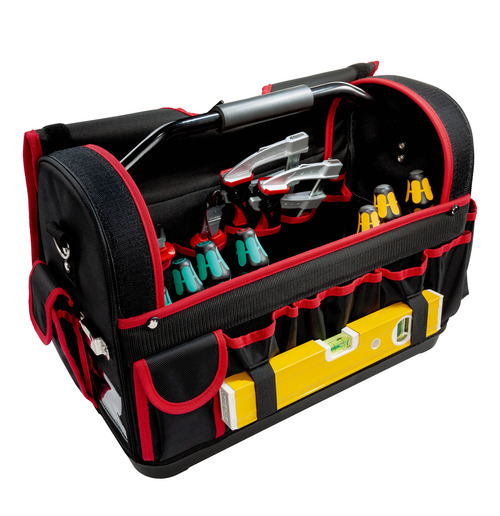 The PARAT BASIC Tool Softbag Size L offers plenty of space to store about 24 tools. The premium nylon tool bag is made to the highest quality standards featuring high-quality materials and impresses with its practical functionality to keep your things in order as you are used to by PARAT. Roughly 17 sewn push-in compartments inside and outside the bag as well as further additional pockets stow away all the working equipment you need. In addition, the Tool Softbag L comes with a lockable special-purpose compartment to store a bucksaw, a tape holder made from metal and a keep-safe compartment that serves as an address label. The plastic-reinforced bag bottom makes the BASIC Softbag L extremely robust and durable. A metal handle and an additional shoulder strap enable convenient and easy transport of the tool bag even when fully loaded. The nylon bag protector with two sewn-in fasteners protects the bag contents from loss, stains or even from theft.