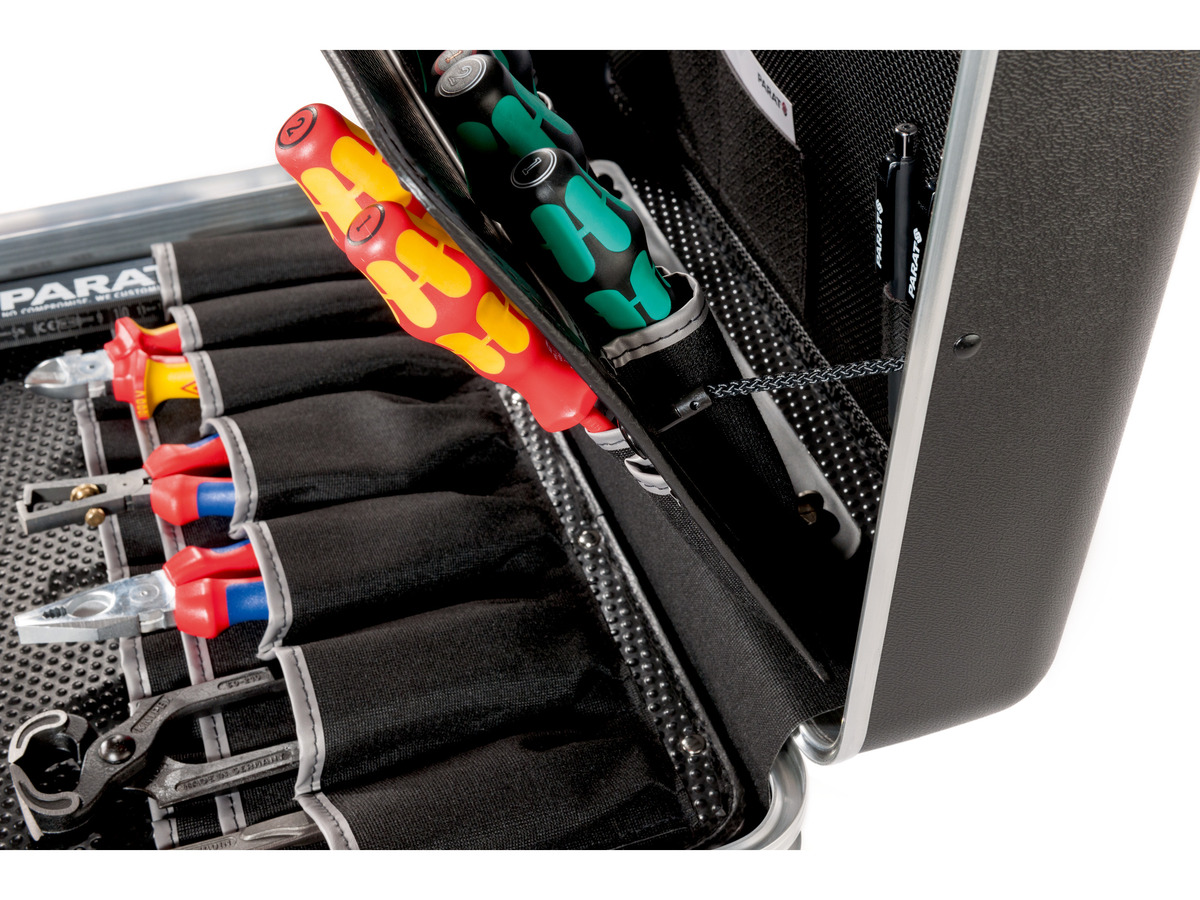 inside you’ll find two push-in compartments and a tool board made of robust Con-Pearl® material plus a practical cover panel on the bottom tray with a total of 40 sewn-in pockets.
