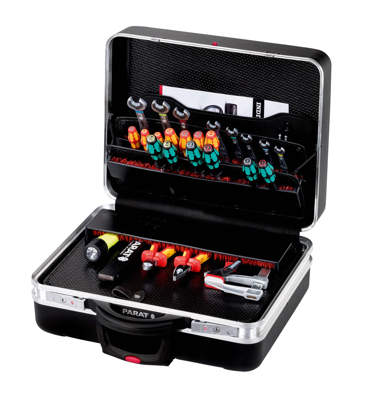 The premium tool case CLASSIC KingSize Roll TSA LOCK™ CP-7 wows customers as a practical trolley case with an extremely large storage space for up to 60 tools. The tool case is fitted with a TSA LOCK™, this guarantees that security staff (e.g. during airport checks) can open the case thanks to its TSA LOCK™ system without damaging it. In addition, the case comes with an exclusive PARAT CP-7 tool holder. This PARAT CP-7 tool holder impresses with its unique clamp system: tools can be flexibly pushed in and securely stowed away.