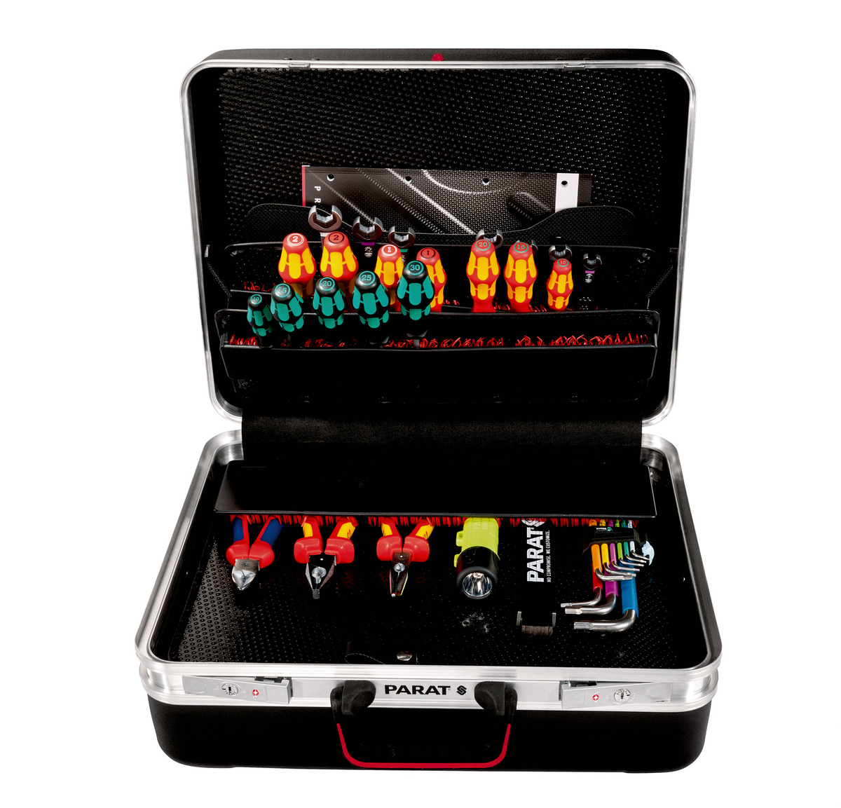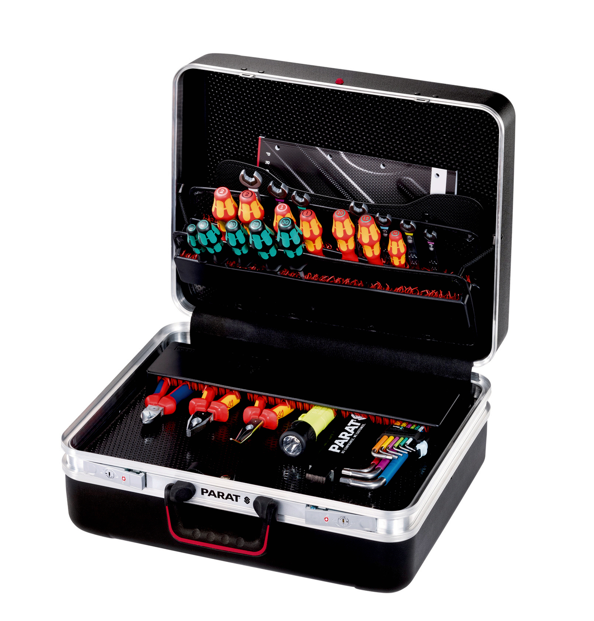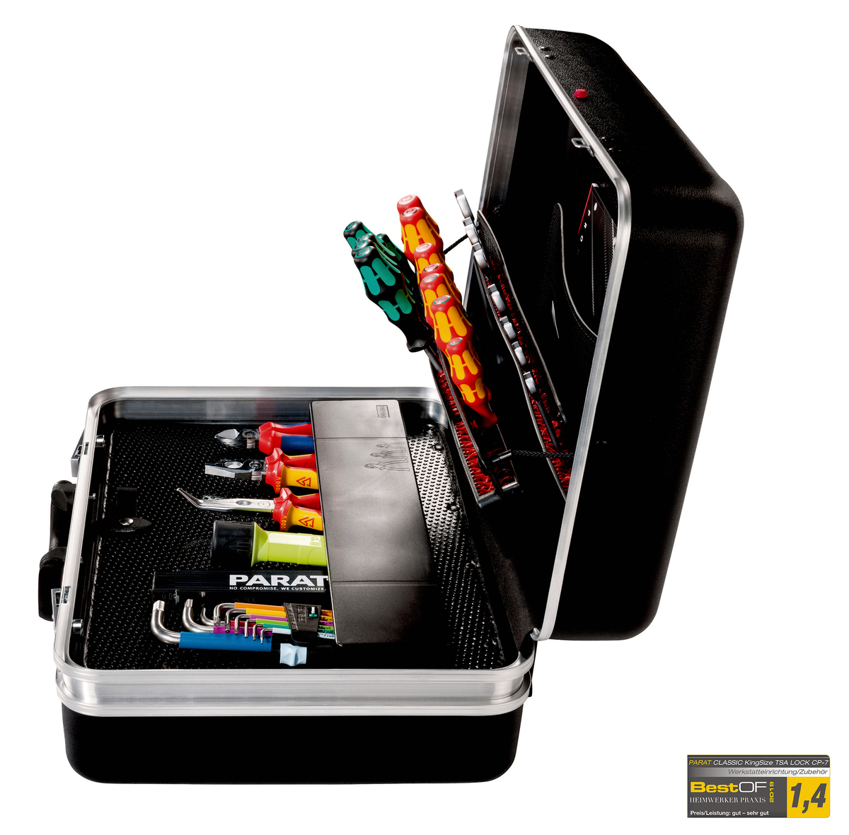 The CLASSIC KingSize TSA LOCK™ wows customers with its sophisticated organising system inside: an extra deep 88 mm bottom tray easily stows away both small parts and bulky tools. Additional working utensils can be stored in high-quality CP-7 tool boards. On top of that, you’ll find two pockets for business cards and a handy keep-safe compartment in the case lid. The case has a capacity of 36 liters and an empty weight of 5.8 kg. Like all models from the CLASSIC series, the CLASSIC KingSize TSA LOCK™ CP-7 is fitted with a unique PARAT carrying handle: its pleasant softtouch surface is extremely resistant to sweat, oils and moisture. Moreover, integrated dimples ensure best carrying comfort of your case, even over several floors.