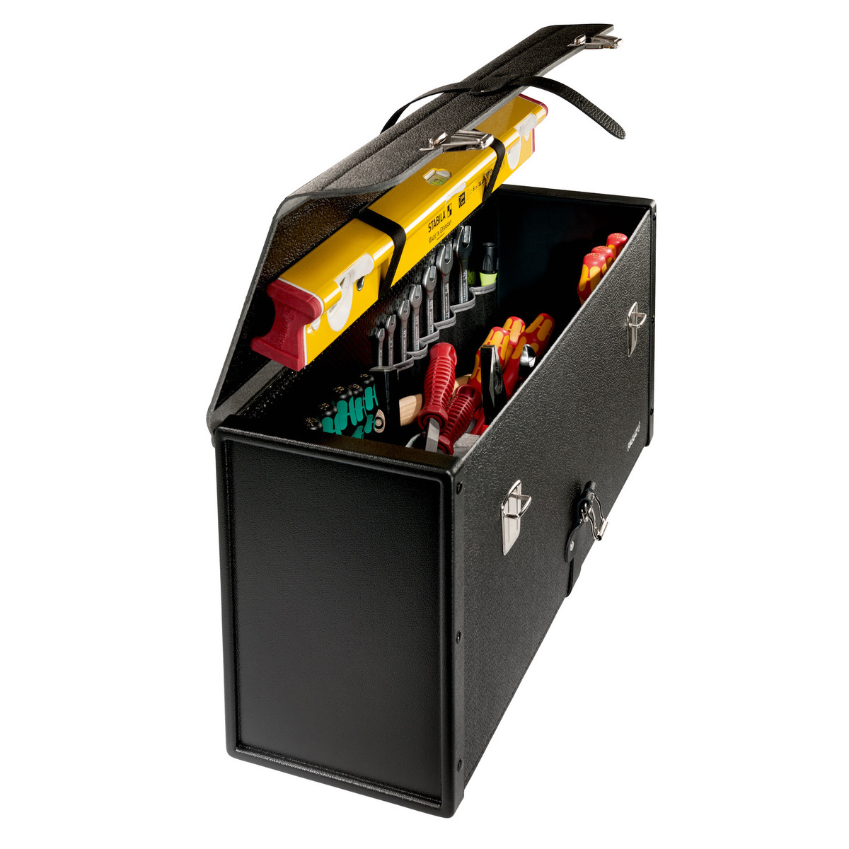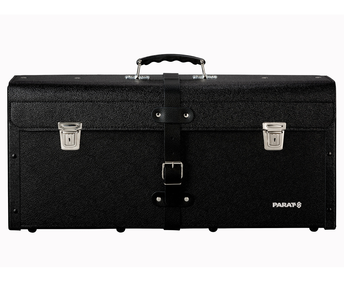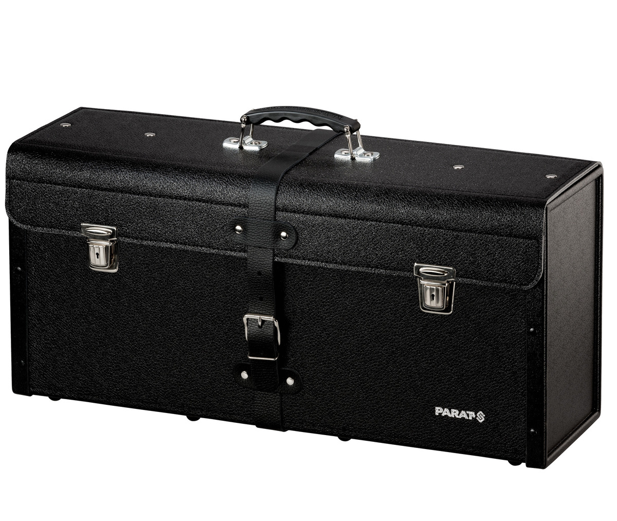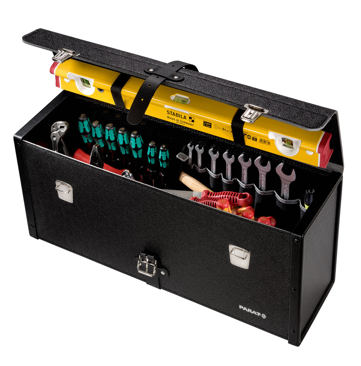 Ideal for extra long tools: the KingSize Long by PARAT from the NEW CLASSIC product line supports especially trade-specific requirements from sanitary professionals. The roughly 635 mm long Premium bag enables transport of extra long and large hand tools and takes about 45 litres with an empty weight of just 2.7 kg. The embossed black industrial leather is hard-wearing and wipeable – this makes the high-quality product extremely easy to clean and durable. Integrated sturdy plastic side panels increase product life and provide additional protection from scratches. 13 fixed tool loops in the front pocket, eight sewn-in separators and seven additional fixed loops on the rear panel as well as practical fasteners inside the case lid guarantee neat storage and safe transport of the tools needed. The large loops are also ideally suited to hold a level – as every tool should have its proper place. The tools inside the KingSize Long are also well protected against theft – thanks to two plug locks and a circumferential strap. Now you are ready to go!
