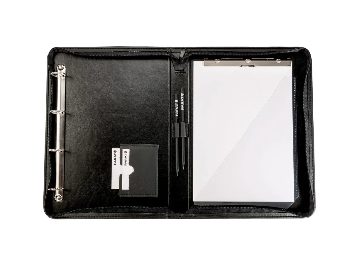This writing case made of durable artificial leather is an essential tool particularly for field workers. Thanks to its clamp holder and the 4-part loose-leaf clamp mounted on the left-hand inner panel, you can transport either documents or writing pads and registers easily in this writing case. In addition, this writing case comes with a transparent sheet protector for A4 format and two pockets for business cards fixed inside. Two fixed and sturdy pencil holders complete the overall look. Thanks to the robust and circumferential zipper, this case can be locked easily and safely, so that your documents are well protected even during transport. The sturdy design of this writing case not only enables transport of your documents, but also is very suitable to write directly in it. This enhances the comfort level considerably.