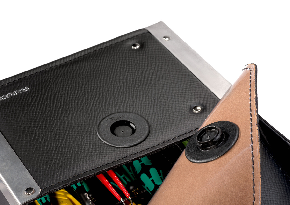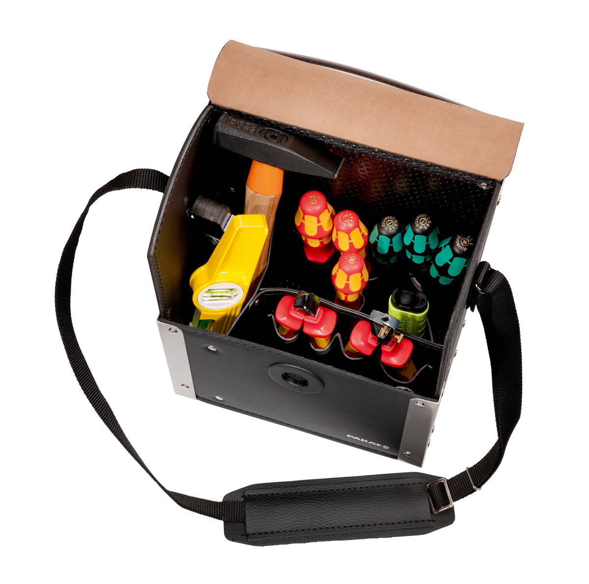The TOP-LINE PARALOCK by PARAT made of extra robust cowhide provides more order and tidiness: with an extremely light weight of just 1.5 kg, the bag offers a capacity of full nine litres to store lots of tools. In order to safely withstand dirt, scratches and shocks, the robust leather is additionally reinforced with sturdy aluminium brackets. Just like all products from the TOP-LINE series, the PARALOCK bag is also extremely durable thanks to its hard-wearing ConPearl®/polypropylene interior fitting. Both front, rear and centre panel come with practical pockets – 17 of them in total. This way, the bag always provides a clear view and safely transports your working material. A transparent keep-safe compartment inside the lid enables neat and tidy storage of important documents. The black tool bag can be locked by the magnetic lock system PARALOCK – allowing simple and safe one-hand operation. Thanks to the comfortable and adjustable shoulder strap, the bag is pleasant to carry: this gives added comfort and makes everyday work life easier.