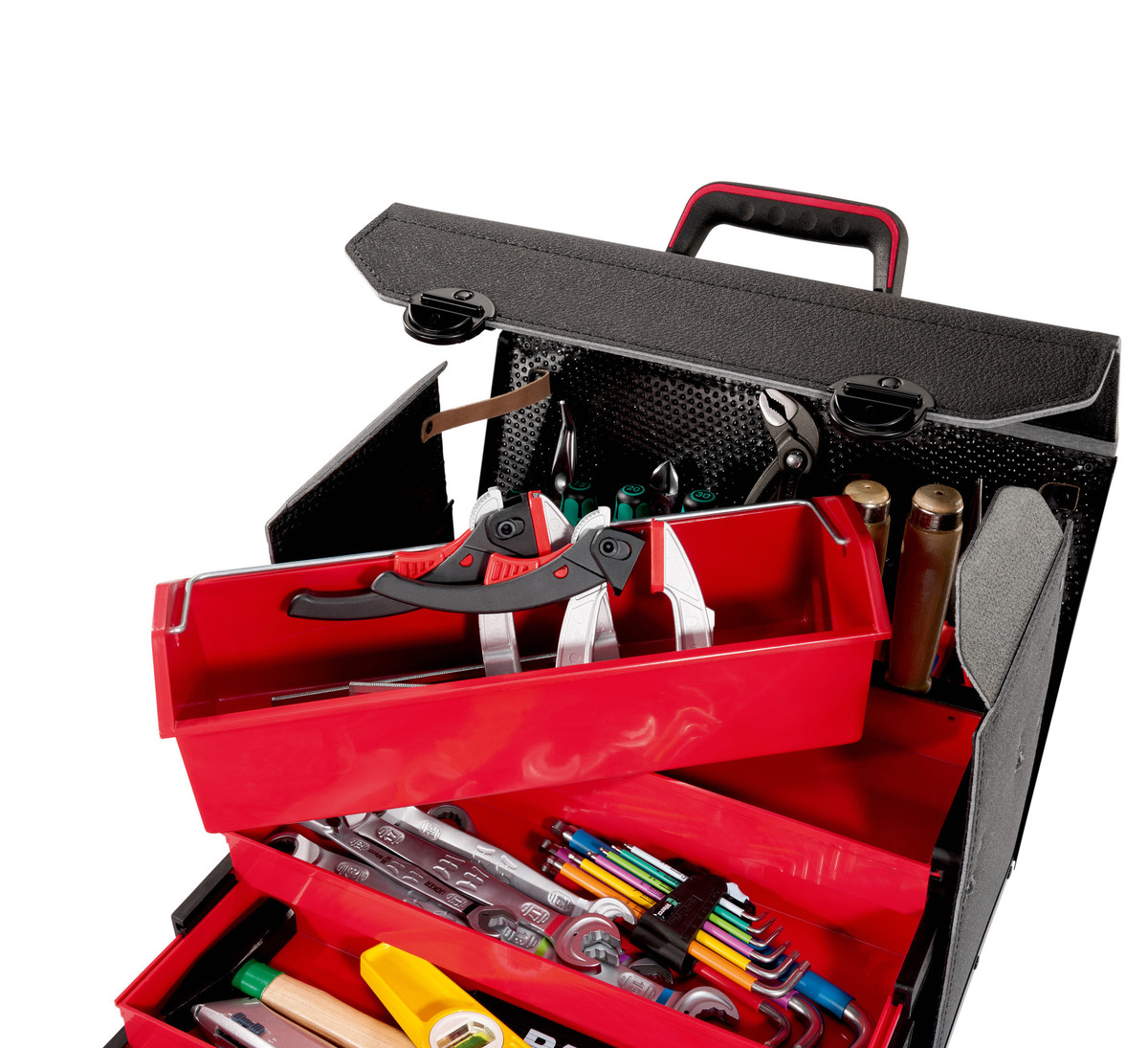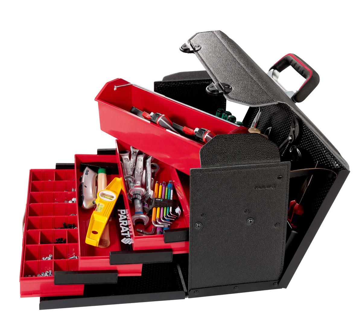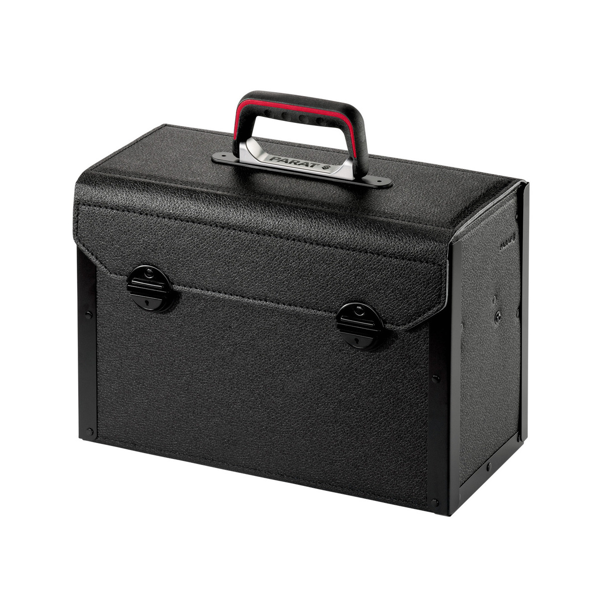 Clever drawer system in elegant design: the PARAT TOP-LINE Plus Organise wows customers with its well thought-out interior concept and even looks really stylish, too. Thanks to the high-quality industrial leather and long-lasting ConPearl® material, the premium tool bag shows first-class workmanship. On top of that, sturdy aluminium brackets on the leather surface make the bag extremely robust. With a capacity of 22 litres and an empty weight of just 4.6 kg, this model provides a huge variety of storage options: along with the 4-part drawer unit, you’ll find two CP-7 tool holders on the middle and rear panel. The robust rear panel is semi-fold-out for easier access to your working materials. When folding out the front panel, you’ll get free access to four drawers: tools and diverse small parts can be flexibly stowed away there. This way, this quality bag is perfectly suitable for neatly storing consumables such as screws, seals or nuts. The TOP-LINE Plus Organise comes with a removable tray in which you can separately transport important working materials. In order to lock away the bag’s contents safely, we integrated easy-to-use ratchet locks. The ergonomic handle and an optional shoulder strap ensure optimum carrying comfort. In short: a true marvel of tidiness for the most diverse tools!