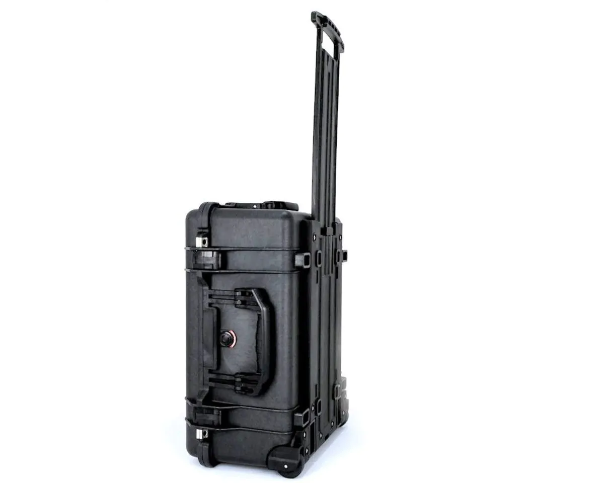 The Peli 1560 comes with wheels and a retractable handle in the following colors: Black, Tan, Olive, and Orange. They are unbreakable, watertight, airtight, and chemical/corrosion-proof as they are made from an ultra high-impact structural copolymer complete with an O-ring forming a watertight seal but with an automatic purge valve for pressure equalization (essential for air travel). It also protects against rough handling, dust, and water, and carries the legendary "you break it, we replace it" lifetime guarantee.