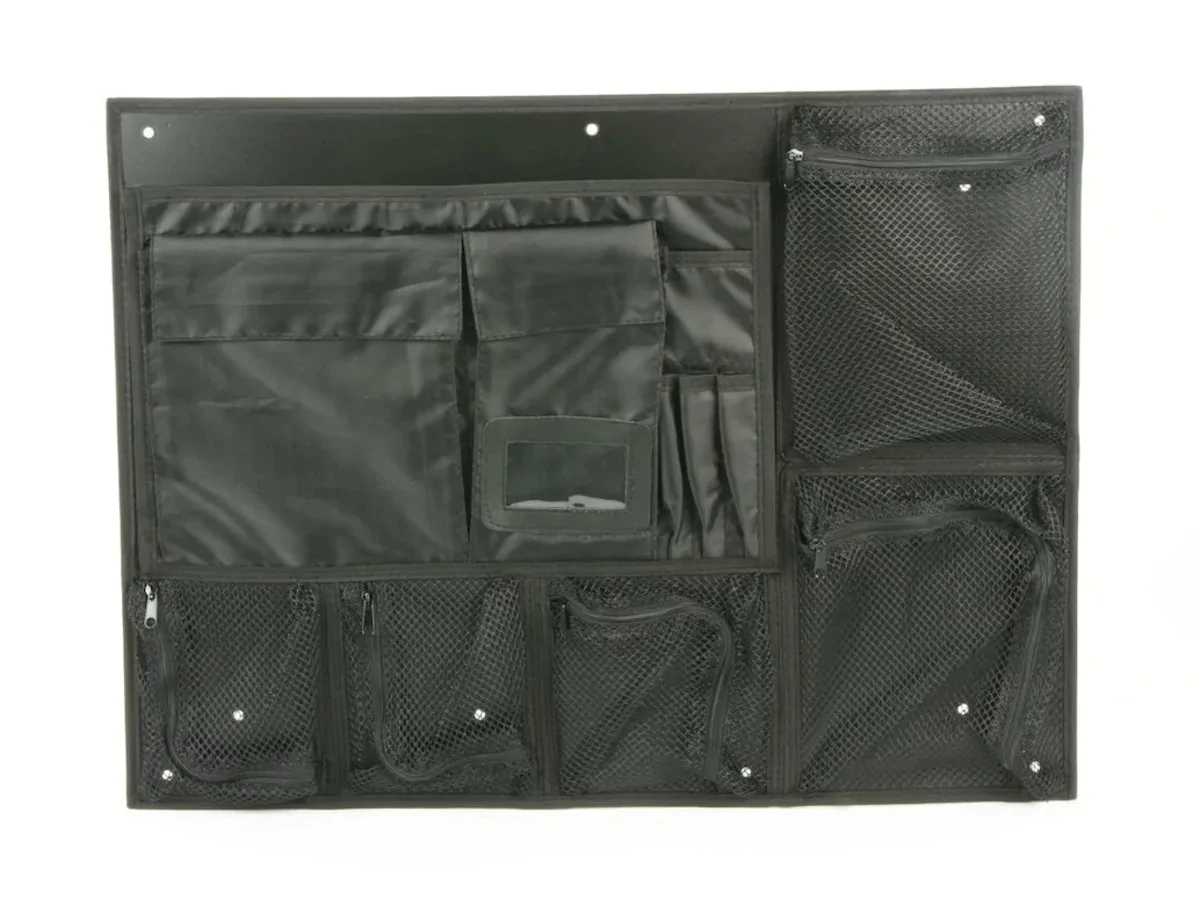 Kit includes lid organizer (5 mesh pockets, 3 pen holders, 1 business card holder, 2 sleeves with velcro flap, 1 large sleeve open top, 1 sleeve open top), 7/16" self tapping screws.
