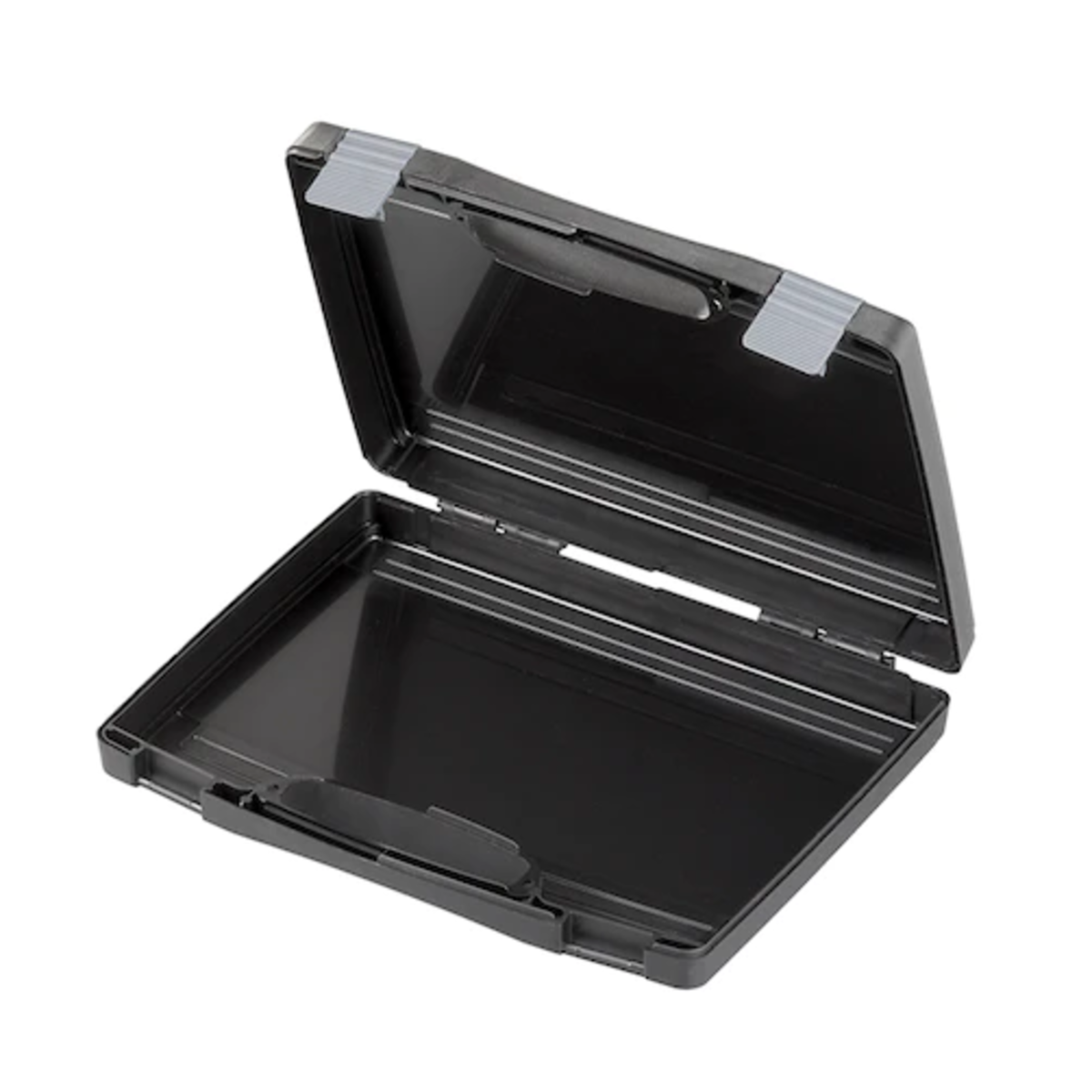 Plastic packaging Case 170/26H44 from the Advanced series with internal dimensions of 248 x 160 x 39 mm / 9.76 x 6.30 x 1.54 inch. Available in black color with grey clips.