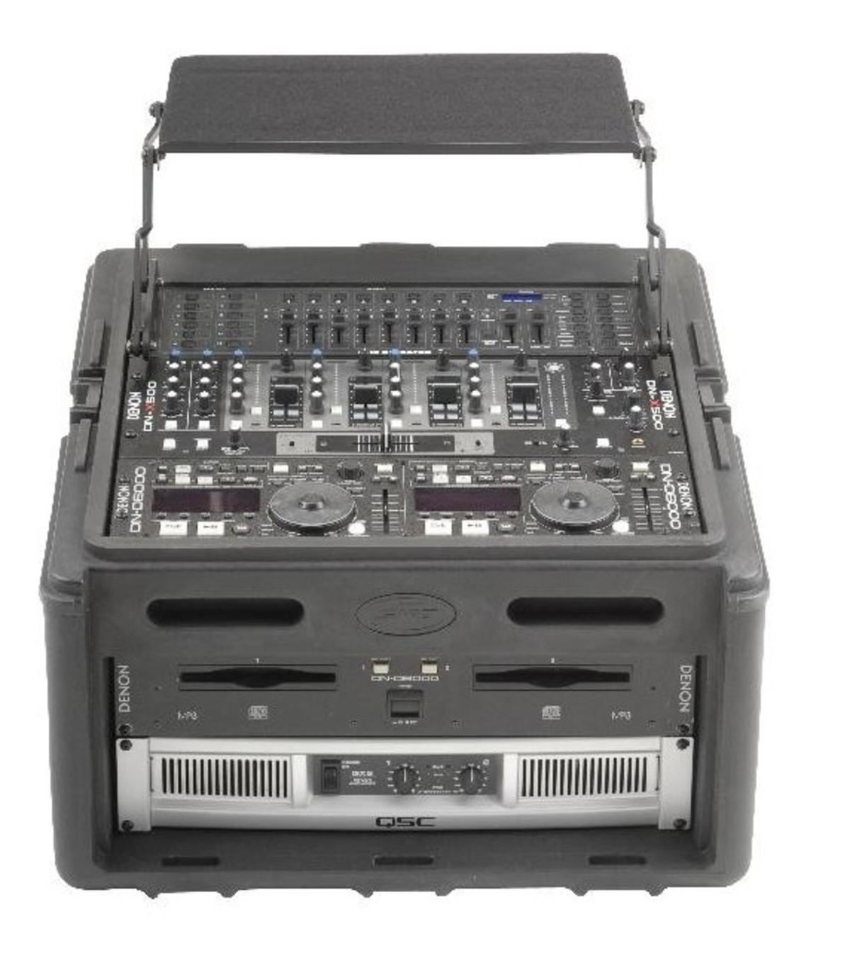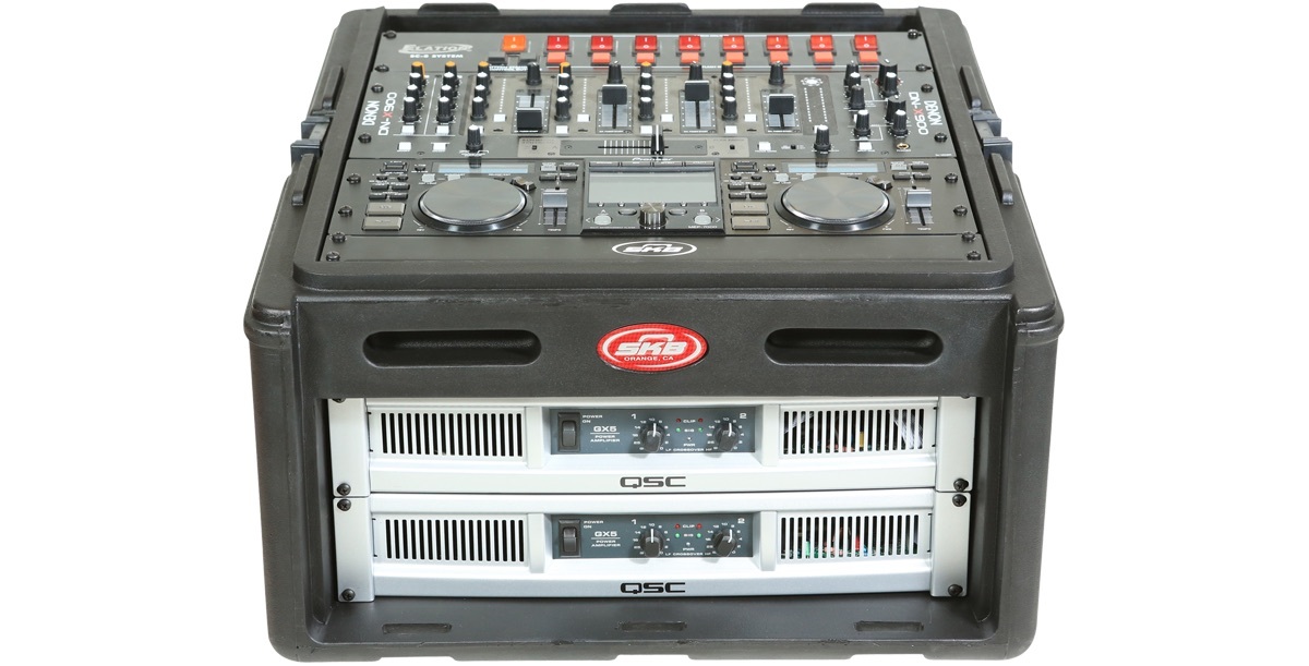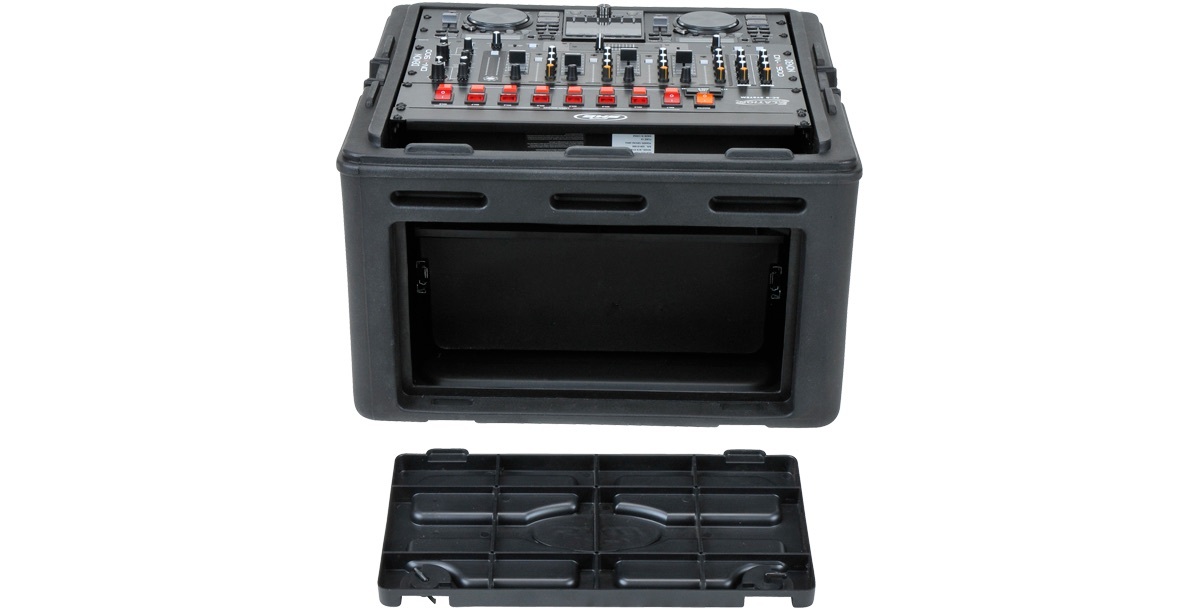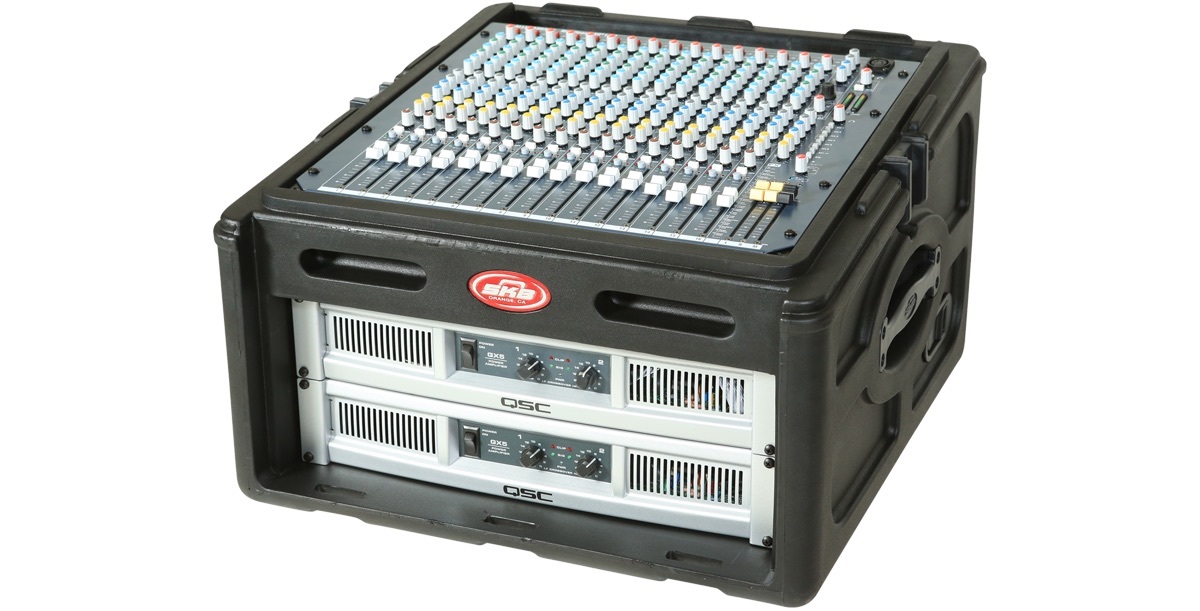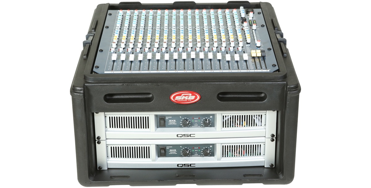 Please note: At the bottom of the top slanted rail, the depth is 3.75". If nothing is mounted in the 4 spaces on the front, then the actual depth at top of the slant rail would actually be 13.5". After the first 3" from the bottom of the slant rail (and with nothing mounted in the 4 spaces on the front), the depth is 11.75". Space between the top of the slant rails and the cover is ~3.5" (to allow XLR/cable connections on mixer with top mounted mic pres). Product weight is without the optional 1SKB-AV8.