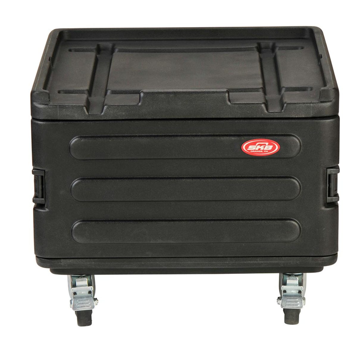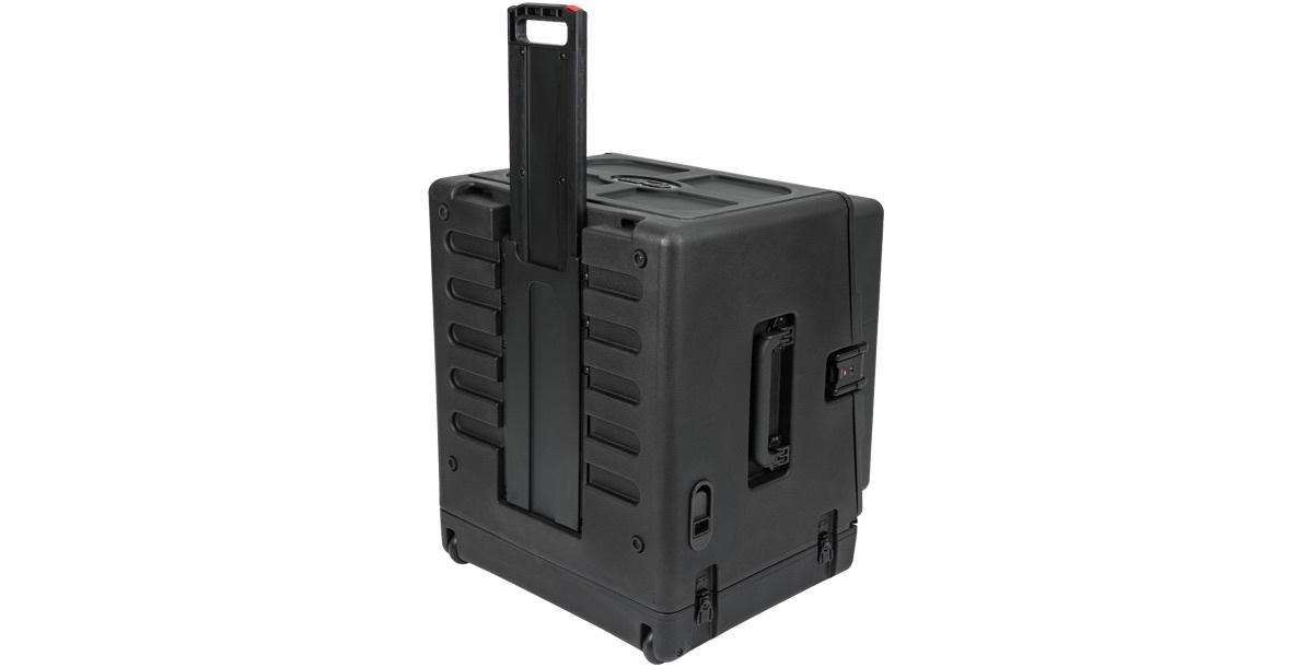 Our all-new 1SKB-R106W Rolling Compact Rig features a standard 10U top and 6U front and rear rack rails. It also includes a new one-touch pull handle and back lid mounted wheels for easy transport, as well as a redesigned exterior that allows this new Rig to easily stack with existing standard Roto-Racks and the recently updated Roto Rolling Racks. Featuring an injection-molded top, the new Rolling Compact Rig also comes standard with TSA-accessible locking latches that secure the lid to the top of the rig.