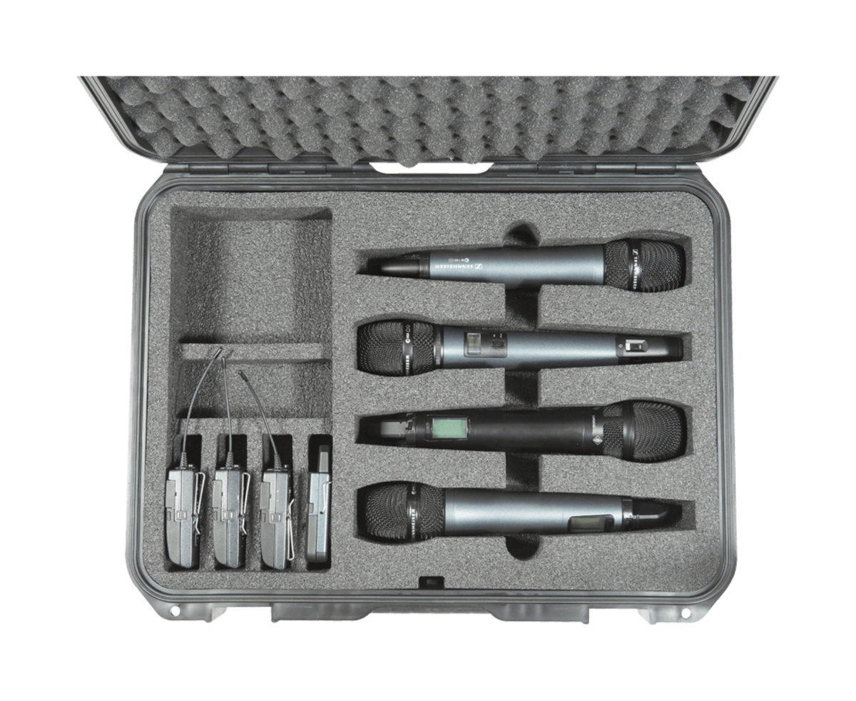 The custom foam interior is designed to cradle each mic and will fit up to four handheld wireless microphones, four wireless body pack transmitters and accessories. Convenient finger holes to quickly grab the microphone and easily slide in the body pack transmitters.