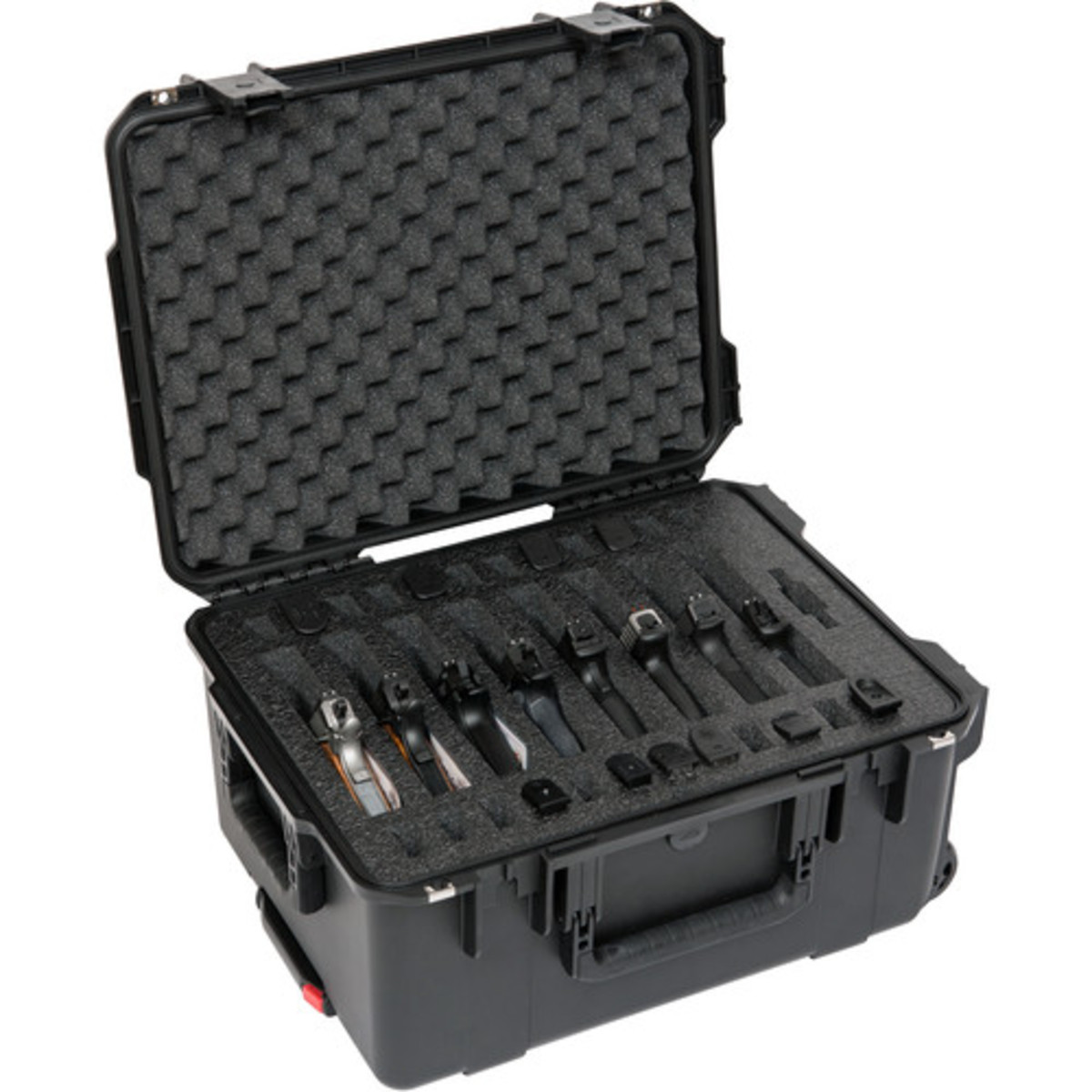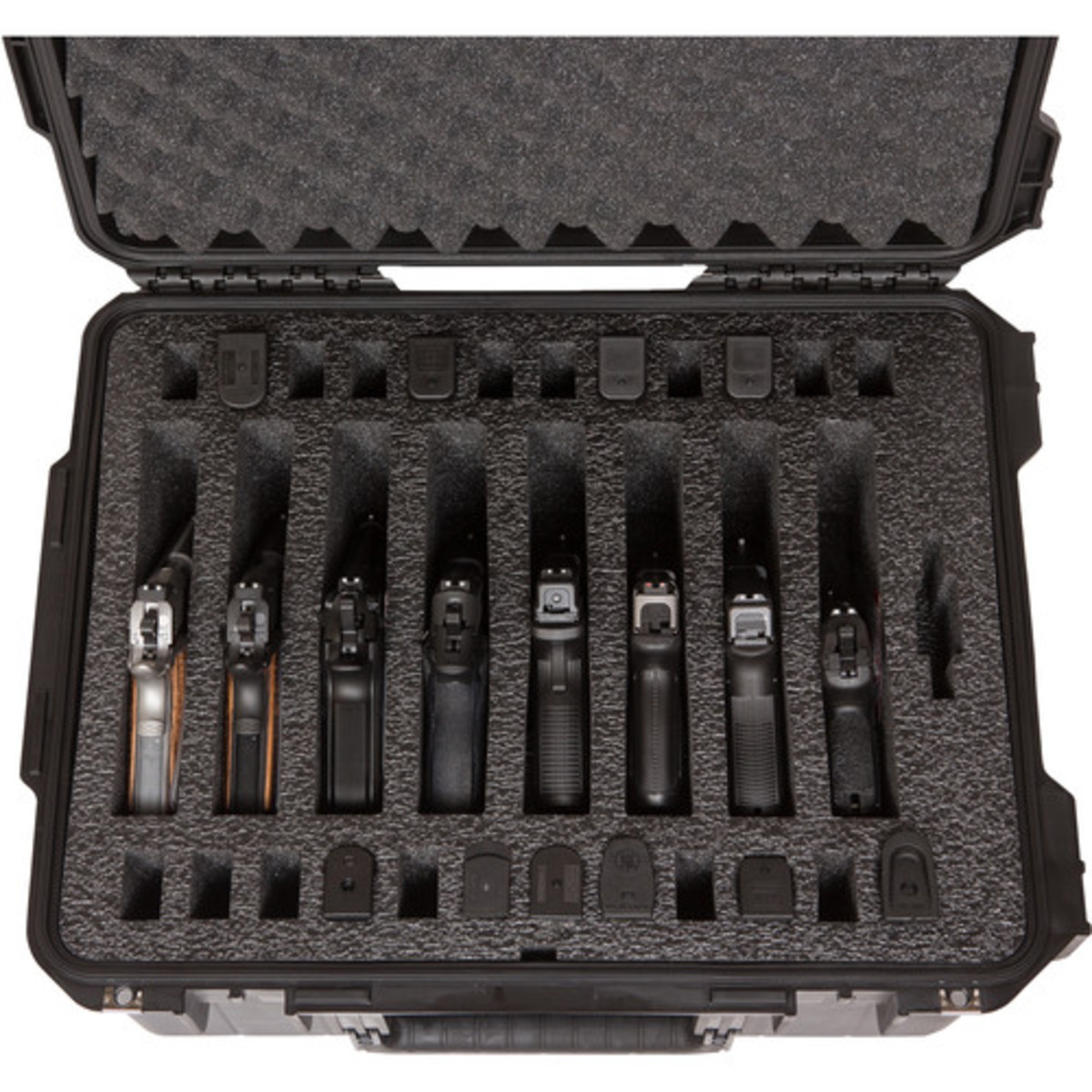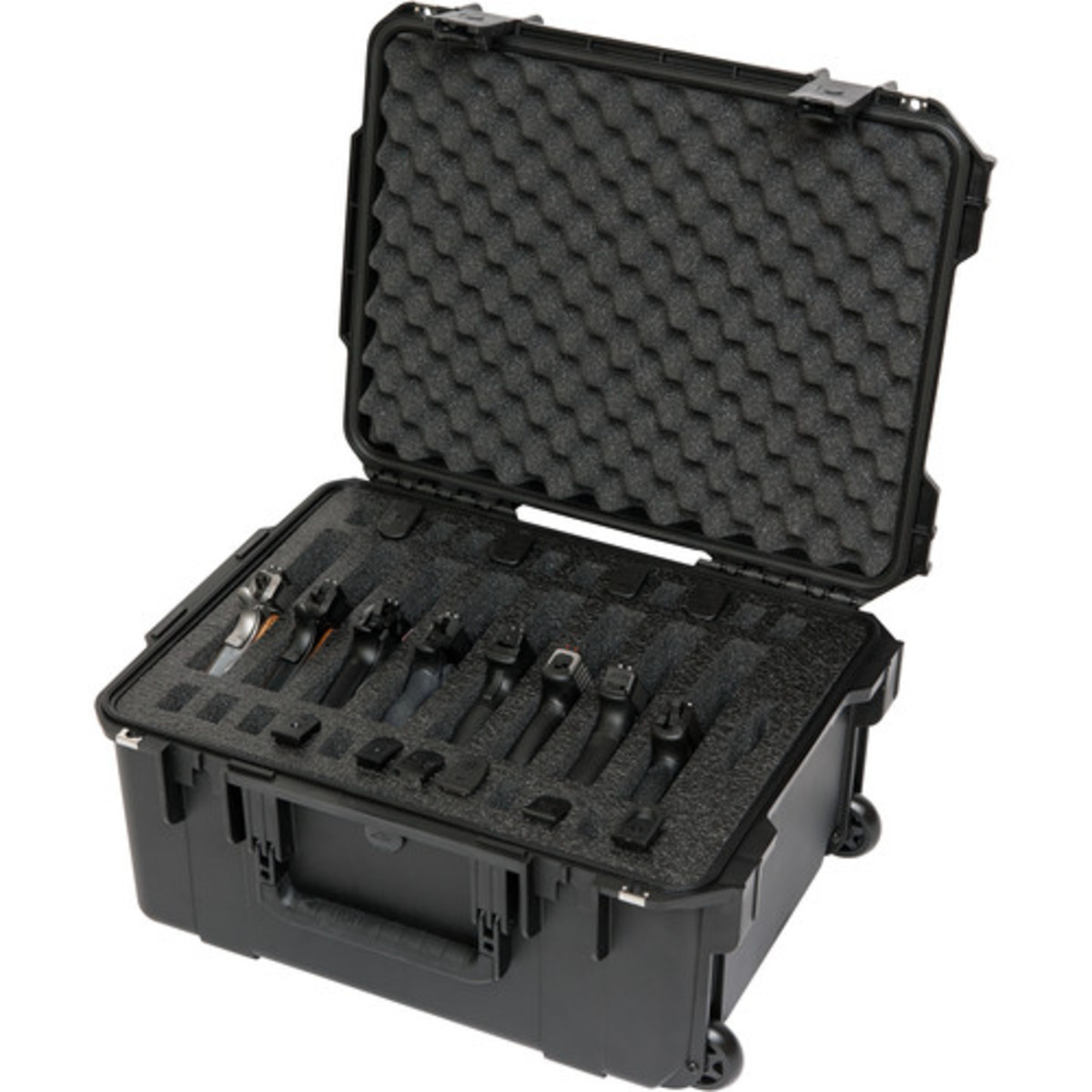 The iSeries 2015-10 Eight Handgun Case is an injection molded, watertight case featuring a customized high density 2lb closed cell foam interior that accommodates eight handguns with designated slots for twenty-four magazines and other accessories. The eight-handgun case features wheels and a pull handle for easy towing, and is a great transport solution for sport enthusiasts, law enforcement, and military personnel alike. The 3i-2015-10B-M is made of ultra high-strength polypropylene copolymer resin, material specified by the U.S. military for cases and containers. It features a gasket-sealed, water and dust-tight submersible design, meeting military standard MIL-C-4150J. The automatic ambient pressure equalization valve self-regulates for different altitudes meeting military standards MIL-STD-648C and IP67. It is resistent to UV, solvents, corrosion, fungus and impact damage, surpassing military standard MIL-STD-810F. The case features a continuous molded-in hinge with a stainless steel pin, a patented "trigger release" latch system, and a comfortable, snap-down, rubber over-molded handle. The 3i-2015-10B-M is comfortable and durable in transport and secure and stable in storage thanks to SKB's interlocking case design. With two padlockable eyelets, the 3I-2015-10B-M is completely secure