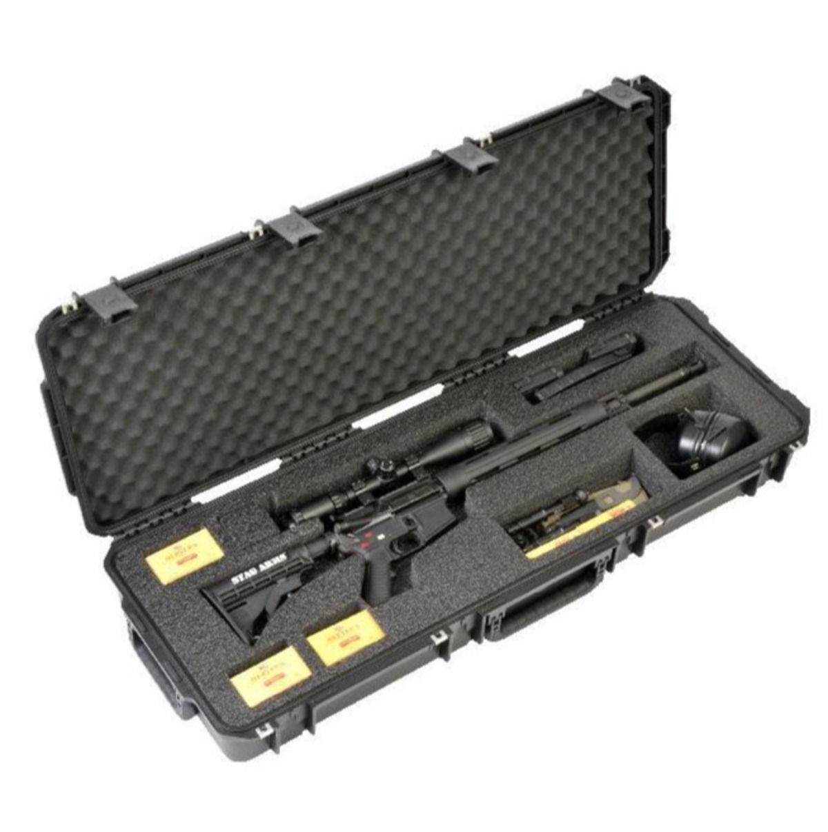 The iSeries 4214 AR Rifle Case is an injection molded watertight case with wheels that features a custom cut, high-density foam interior and is perfect for shorter, tactical, assault type rifles.The interior features a heavy-duty 2 Lb. density closed-cell, recyclable foam with 7 separate cavities to securely hold your AR and all your accessories. The AR cavity has adjustable pull-out foam plugs to accommodate overall lengths up to 41". The area around the scope also has adjustable pull-out foam plugs to accommodate various scope sizes.All SKB iSeries Injection Molded Mil-Standard Waterproof Cases are molded of ultra high-strength polypropylene copolymer resin, featuring a gasketed, water and dust tight, submersible design (MIL-C-4150J) that is resistant to corrosion and impact damage. Features a molded-in hinge, patented "trigger release" latch system, comfortable, snap-down rubber over-molded cushion grip handle, automatic ambient pressure equalization valve (MIL-STD-648C), resistance to UV, solvents, corrosion, fungus and impact damage (MIL-STD-810F).