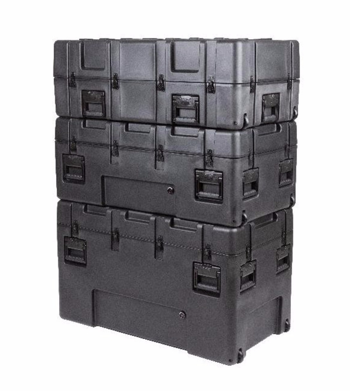 These Mil-Standard cases were designed to meet the most demanding military specifications. They are roto-molded for strength and durability, airtight and water proof with solid stainless steel latches and hinges that will withstand the most demanding shipping conditions.The 3R Mil-Std. Cases are molded of (LLDPE) polyethylene impact resistant / UV stabilized material and meet or exceed MIL-STD 810 and MIL-C-4150J specifications.The shipping cases are all available with an empty interior while some models are available with: cubed foam, layered foam, padded dividers, and a pull handle with wheels.Wheel options vary by case.