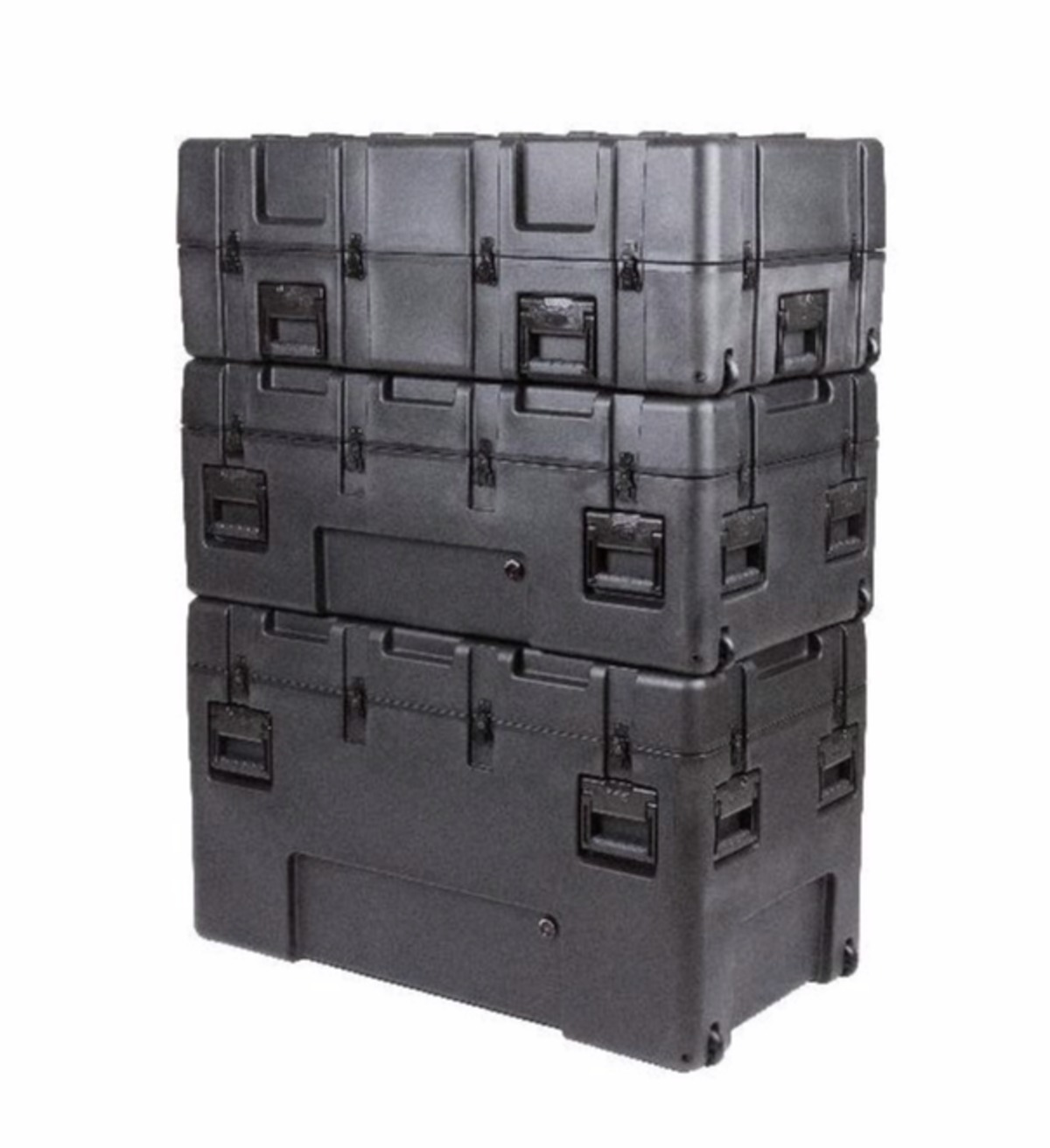 These Mil-Standard cases were designed to meet the most demanding military specifications. They are roto-molded for strength and durability, airtight and water proof with solid stainless steel latches and hinges that will withstand the most demanding shipping conditions.The 3R Mil-Std. Cases are molded of (LLDPE) polyethylene impact resistant / UV stabilized material and meet or exceed MIL-STD 810 and MIL-C-4150J specifications.The shipping cases are all available with an empty interior while some models are available with: cubed foam, layered foam, padded dividers, and a pull handle with wheels.Wheel options vary by case.