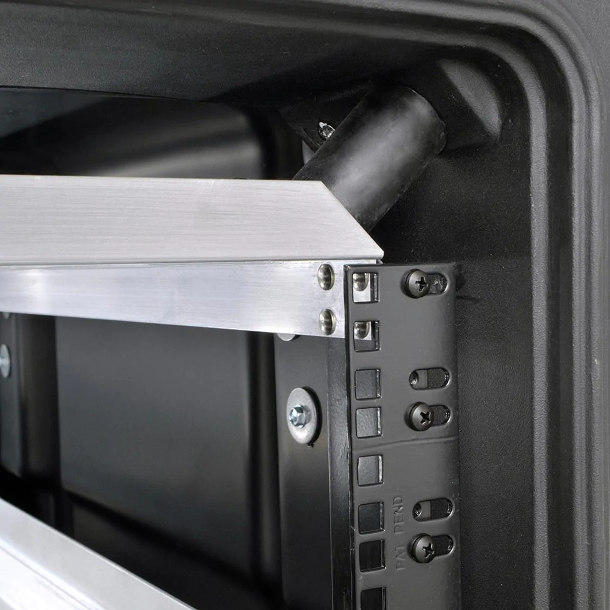 This case has all of the same great features as the 24″ deep Roto Shock Series. Standard features include: (patent pending) compound hinged doors, black powder coated stainless steel latches, removable 4″ casters. The inner rack chassis is built of high strength / lightweight aluminium alloy and 11 gauge hot rolled carbon steel rack rails to DIA-310 standards. Shock and vibration mitigation is accomplished with eight (8) elastomeric isolators rated for a payload range of 40 lbs. to 150 lbs. in a standard configuration and up to 300 pounds in a special order extended payload configuration allowing adequate sway space for ambient air circulation and heat dissipation with black powder coated stainless steel latches, gasketed doors and pressure relief valve.