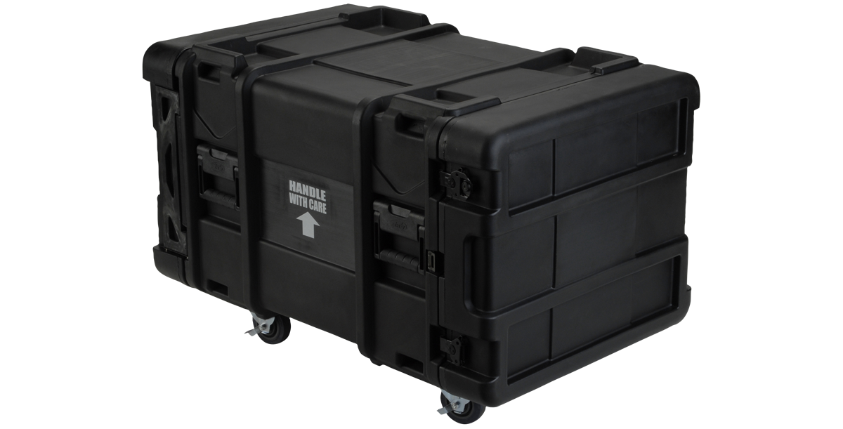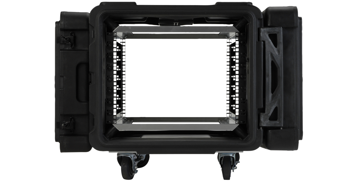 Both front and rear lids are designed to protrude into the base of the case approximately 1" with a unique double wall structure that makes them incredibly rigid where this intersection occurs, providing MIL-SPEC sealing characteristics with significantly fewer latches than most competitive cases. This revolutionary design allows for rapid deployment in an up-right configuration, even when stacked -- 3SKB Roto Shock Racks are the only shock racks in the marketplace today that will open front and back while stacked.