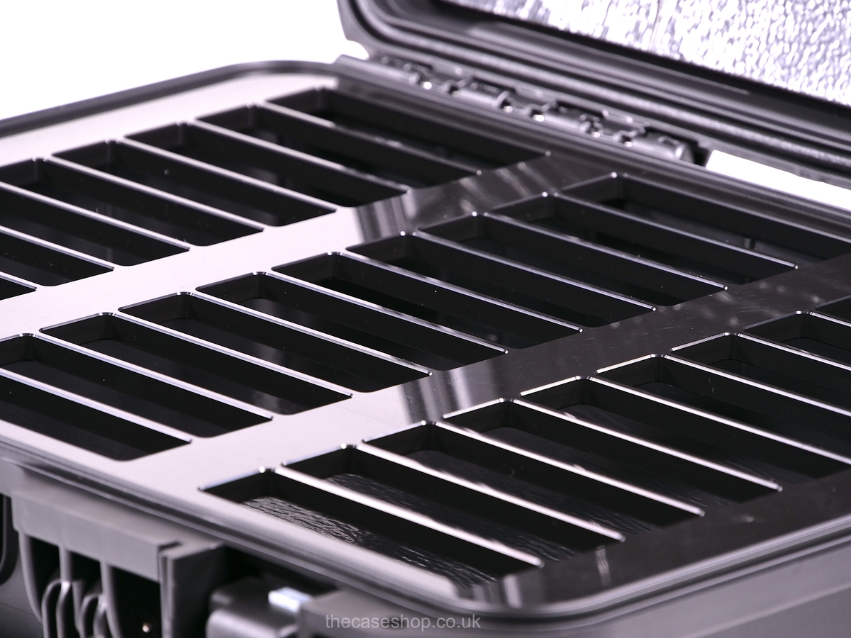Airtight, waterproof ATA certified case with individual slots, superior cushioning and no exposed debris generating agents.